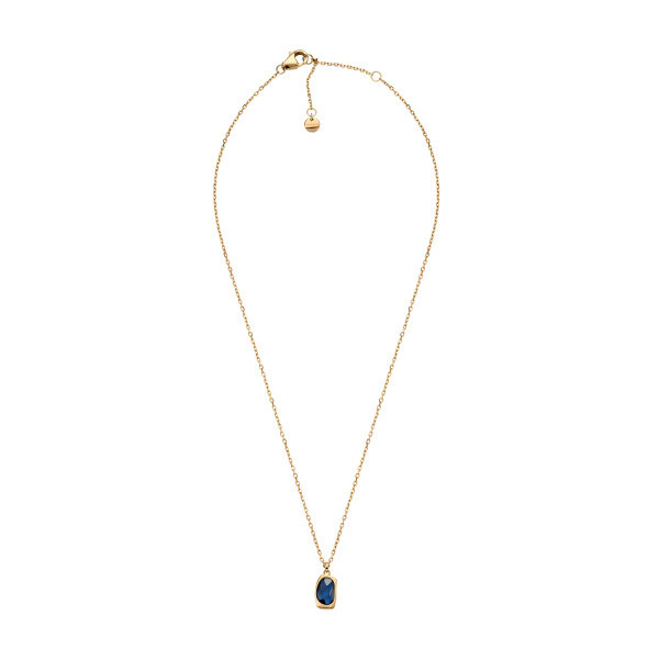 Girocollo della linea Sofie Sea Glass in acciaio anallergico con trattamento pvd dorato con catena in maglia forzatina e pendente di forma irregolare 5 x 10 mm con vetro sfaccettato di colore blu. Chiusura con moschettone, misura regolabile con tre lunghezze diverse. Packaging dedicato
