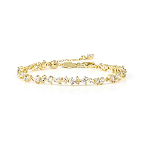 Bracciale semirigido della collezione Colour Wave mini in argento 925 dorato in sottile maglia rolò con 5 elementi semirigidi composti da cubic zirconia trasparenti di diversi tagli. Misura regolabile a piacimento grazie alla chiusura con moschettone scorrevole. Prodotto in Italia, packaging dedicato.
