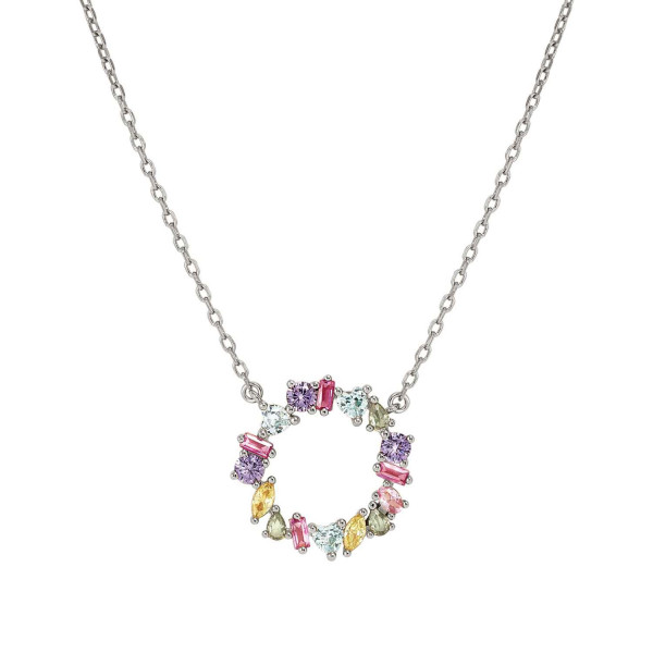 Collana della collezione Colour Wave mini in argento 925 lucido in sottile maglia rolò con cerchio centrale di misure 1,7 x 1,7 cm composto da cubic zirconia multicolor di diversi tagli. Misura regolabile a piacimento grazie alla chiusura con moschettone scorrevole. Packaging dedicato, prodotto in Italia.