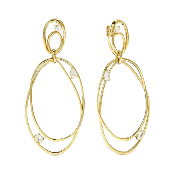 Importanti orecchini con pendenti della linea My Rebel Art in argento 925 dorato con doppio ovale all'interno del quale sono incassati tre cubic zirconia bianchi di forme diverse. Chiusura a farfallina. Prodotto in Italia, packaging dedicato.