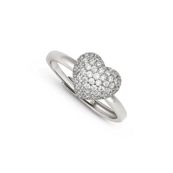 Anello della linea Lifepoetry in argento 925 lucido con cuoricino bombato con pavè di cubic zirconia bianchi di circa 1 cm. Misura regolabile, dalla taglia 11 alla 17. Prodotto in Italia, packaging dedicato.