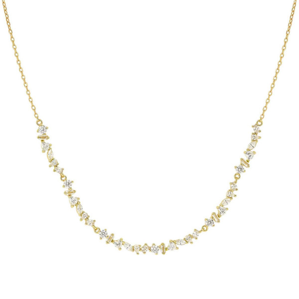 Girocollo semirigido della collezione Colour Wave mini in argento 925 dorato in sottile maglia rolò con 5 elementi semirigidi composto da cubic zirconia trasparenti di diversi tagli. Misura regolabile a piacimento grazie alla chiusura con moschettone scorrevole. Packaging dedicato, prodotto in Italia.