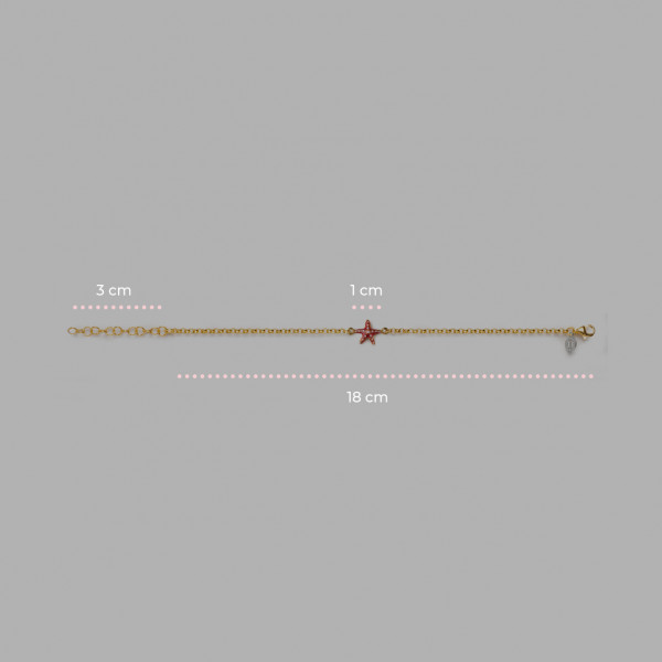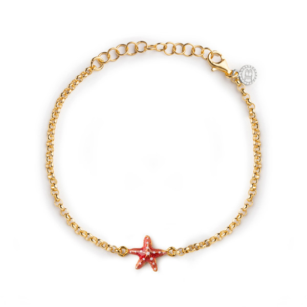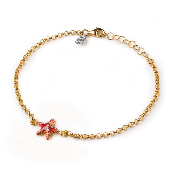 Braccialetto Isola Bella realizzato a mano in Sicilia in argento 925 con finitura dorata in maglia rolò con al centro stella marina di 1 cm smaltata rossa e bianca. Chiusura a moschettone, misura regolabile grazie agli anellini finali, confezione dedicata