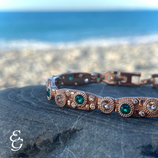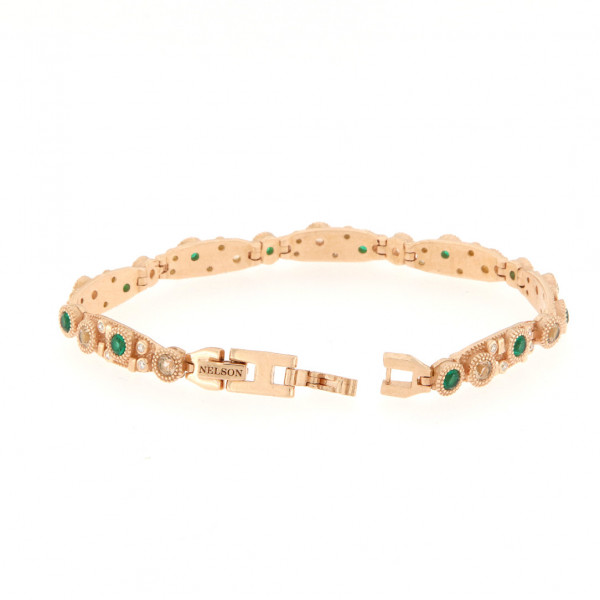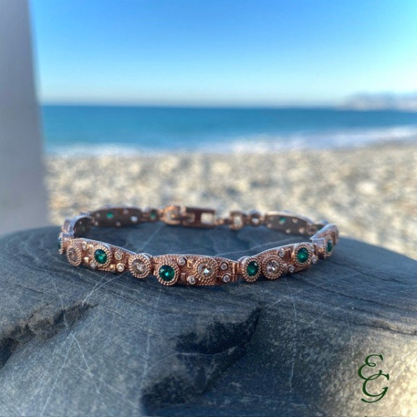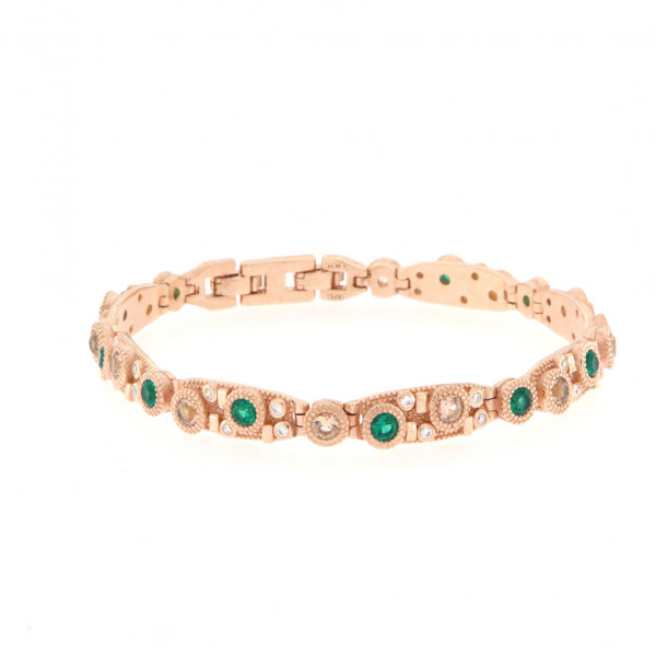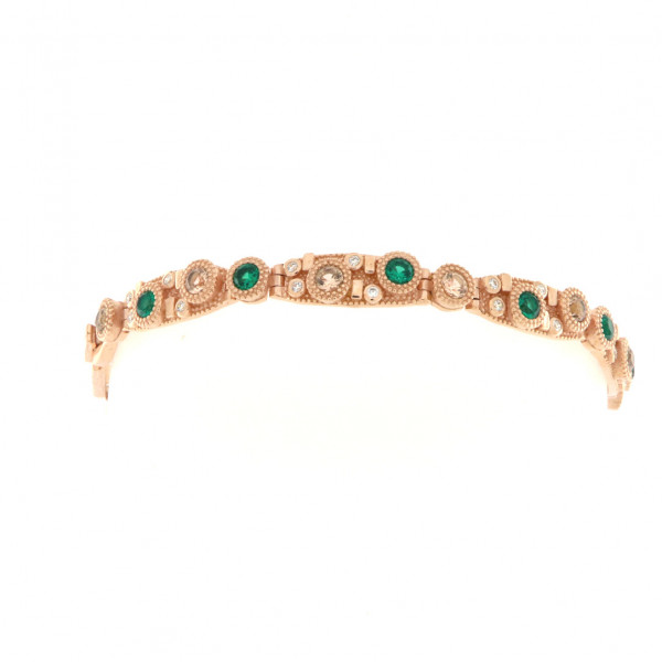 Splendido bracciale semirigido della collezione Pietrasanta in argento rosato con finitura anticata con quarzi verdi e champagne e zirconi bianchi. Chiusura a scatto, misura regolabile grazie alla prolunga. Prodotto artigianale made in Italy.
