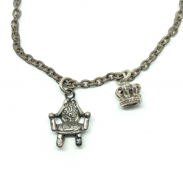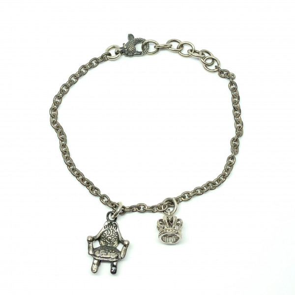 Bracciale principesco in maglia gourmette con ciondoli a forma di trono e di corona. Chiusura con moschettone puntinato. Solo per vere principesse!