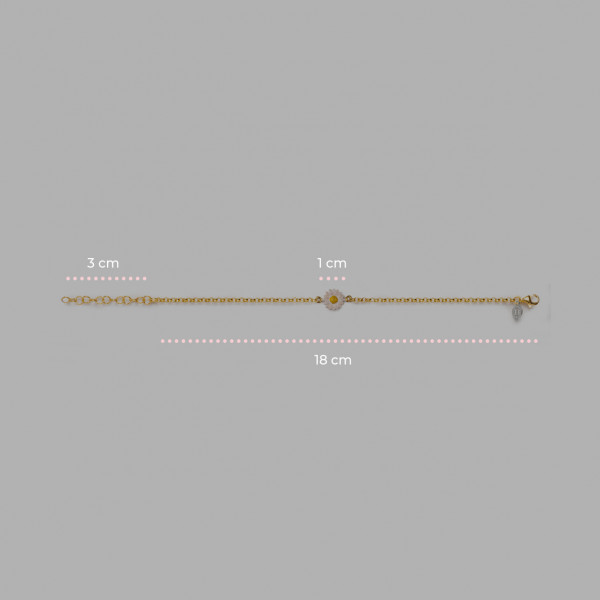 Braccialetto Isola Bella realizzato a mano in Sicilia in argento 925 dorato con catena in maglia rolò e al centro graziosa margherita da 1 cm di diametro smaltato di colore bianco e giallo. Chiusura con moschettone, misura regolabile grazie agli anellini finali. Packaging dedicato con scatola e shopper.