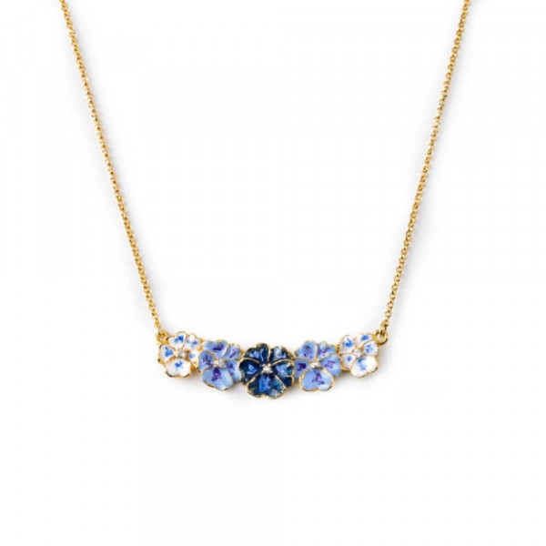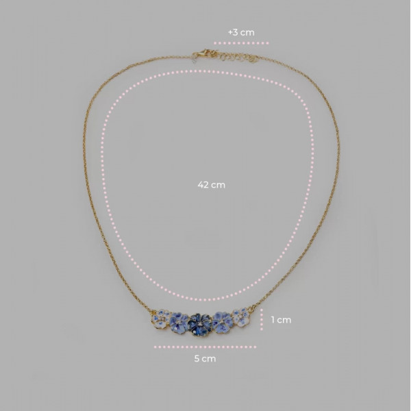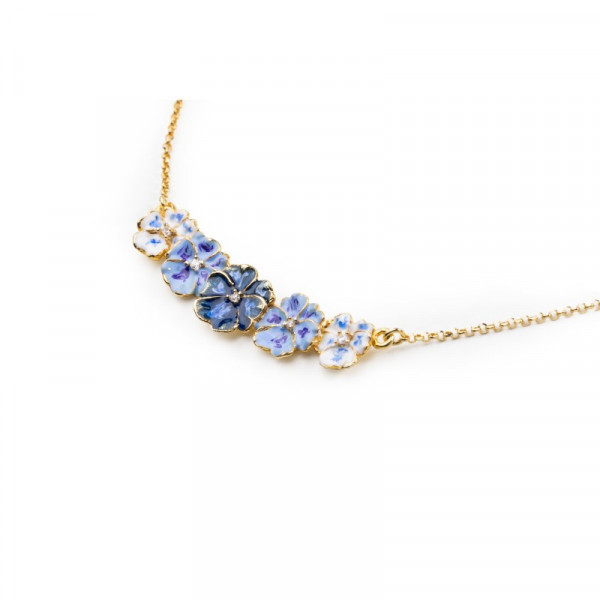 Girocollo Isola Bella realizzato a mano in Sicilia in argento 925 dorato con catena in maglia rolò con al centro 5 deliziose violette smaltate nei toni del blu e del viola di circa 4,5 cm x 1 cm. Al centro di ciascun fiore, splende uno zircone trasparente. Chiusura con moschettone regolabile grazie agli anellini finali. Packaging dedicato con scatola e shopper.
