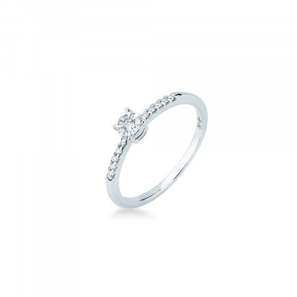 Anello solitario Mirco Visconti con montatura in oro bianco 750 o/oo con al centro castone con diamanti taglio brillante con incassatura Magic e brillantini sui lati, per un totale di ct 0,11. Prodotto in Italia, garanzia ufficiale e packaging dedicato