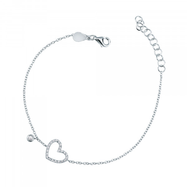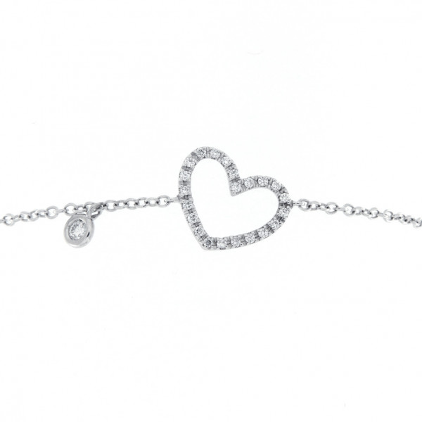 Braccialetto morbido Mirco Visconti in maglia forzata in oro bianco 18 kt con cuore vuoto al centro di cm 1,2 con contorno di brillanti e charm pendente con brillantino, per un totale di 0,11 ct. Chiusura a moschettone, misura regolabile. Garanzia ufficiale e packaging dedicato