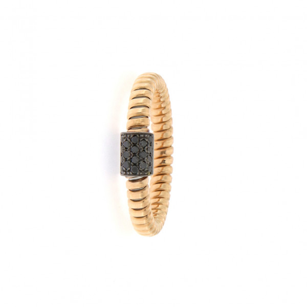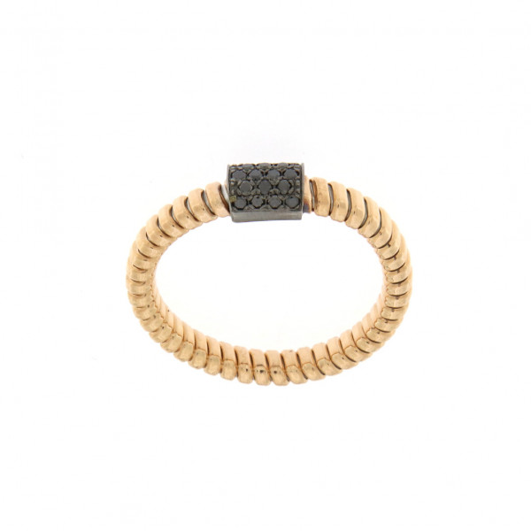 Originale anello in oro rosa 18 kt con gambo da 3 mm lavorato in stile canna del gas e inserto centrale in oro brunito con pavèe di brillanti neri di ct 0,13 totali. Prodotto artigianale realizzato in Italia