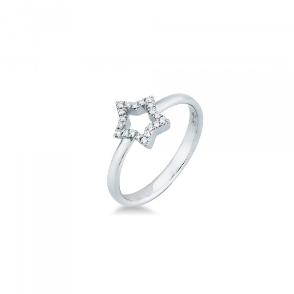 Grazioso anello Mirco Visconti prodotto in Italia con montatura a filo semitondo in oro bianco 750 o/oo con al centro stella forata di 8mm con contorno di brillanti di ct 0,09. Packaging dedicato, garanzia ufficiale e certificato internazionale di sostituzione