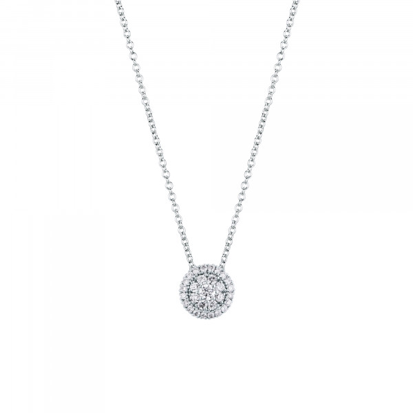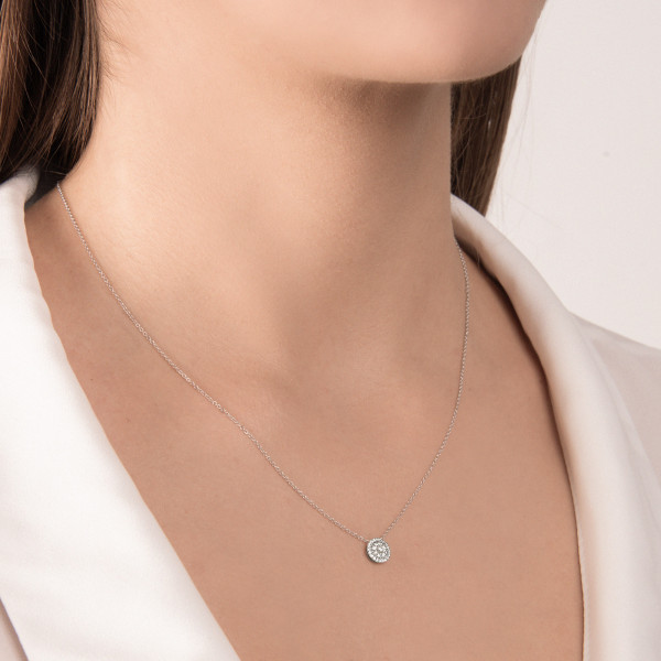 Girocollo Mirco Visconti in oro bianco 750 o/oo con catena in sottile maglia rolò e pendente di forma tonda di 7,5 mm con 0,19 ct di brillanti con incassatura Magic. Chiusura a moschettone, misura regolabile in due lunghezze diverse. Prodotto in Italia, packaging dedicato e certificato di garanzia