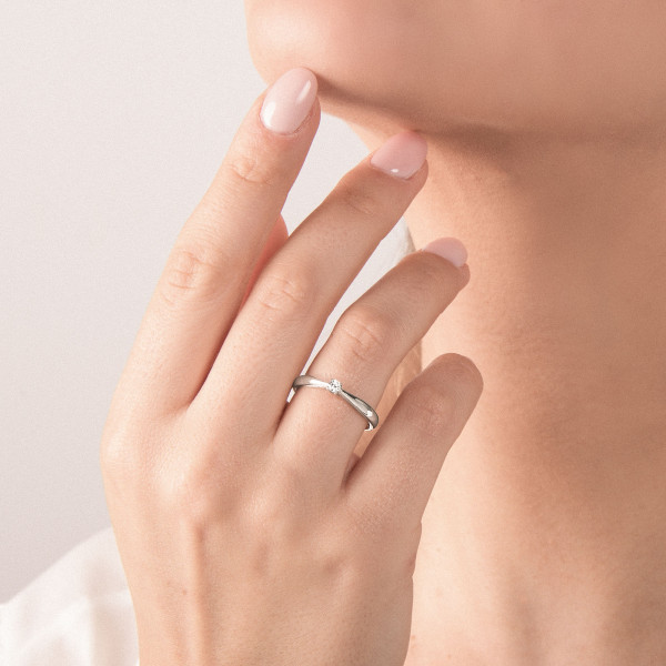 Anello solitario Mirco Visconti con montatura in oro bianco a filo mezzo tondo, svasato nella parte superiore con castone quadrato con brillante di ct 0,06. Prodotto in Italia, packaging dedicato con garanzia ufficiale