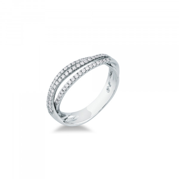 Anello Onde Mirco Visconti con montatura in oro bianco 750 o/oo con parte superiore separata in tre fili di altezza differente con brillanti di ct 0,28 complessivi incassati. Prodotti in Italia, packaging dedicato e garanzia ufficiale