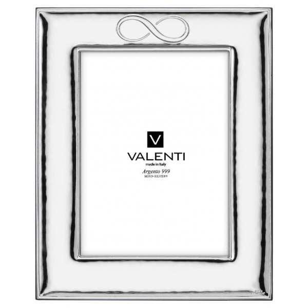 Raffinata cornice Valenti per fotografie 13 x 18 cm in argento 999 Miro-Silver, con bordo di 4 cm con lavorazione martellata e finitura lucida. Sul bordo superiore si trova in rilievo il simbolo dell'infinito, che è associato a sentimenti come l'amore, l'affetto e l'amicizia. Ideale come idea regalo per le vostre occasioni speciali.