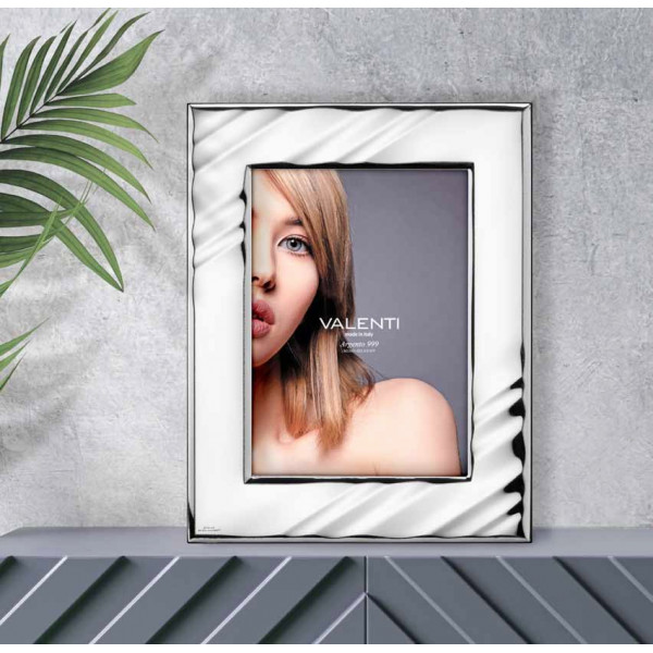 Elegante cornice rettangolare in legno scuro con fascia larga in argento Miro Silver per fotografie di dimensioni 13x18 cm. La cornice ha finitura lucida e lavorazione ondulata agli angoli contrapposti. Retro in legno scuro opaco e possibilità di posizionamento sia verticale che orizzontale.