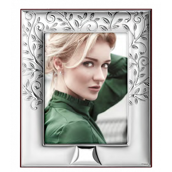 Cornice Valenti in argento bilaminato per foto 13 x 18 cm con disegno dell'albero della vita a rilievo lucido e satinato su bordo di 3,5 cm. Adatta per diverse occasioni speciali (ad esempio matrimonio, nuova nascita, anniversario) questa cornice è un regalo simbolico e carico di significato. Retro in legno bianco.