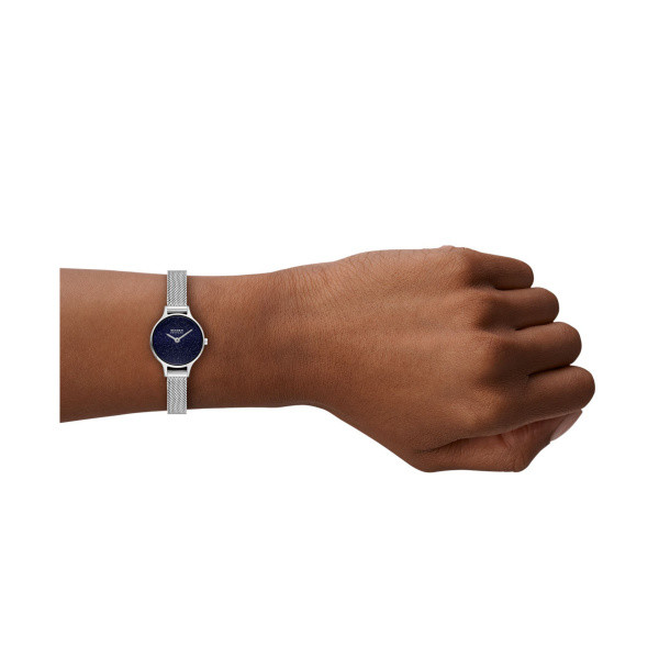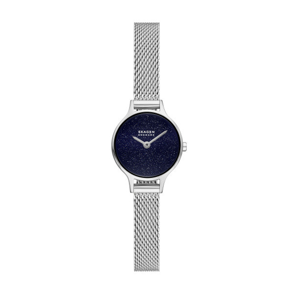 Orologio miniaura della linea Anita con cassa tonda da 22 mm in acciaio e sottile bracciale in maglia Milano. Monta movimento a batteria su splendido quadrante blu brillantinoso in vera pietra con 2 lancette silver. Impermeabile fino a 3o metri, packaging dedicato