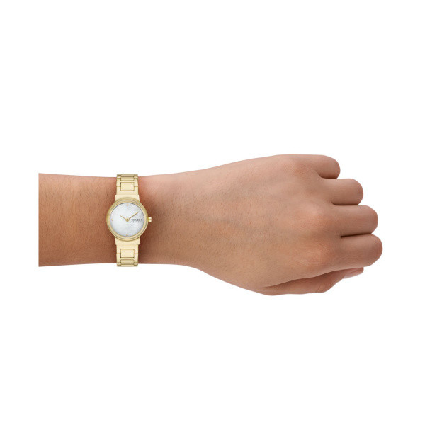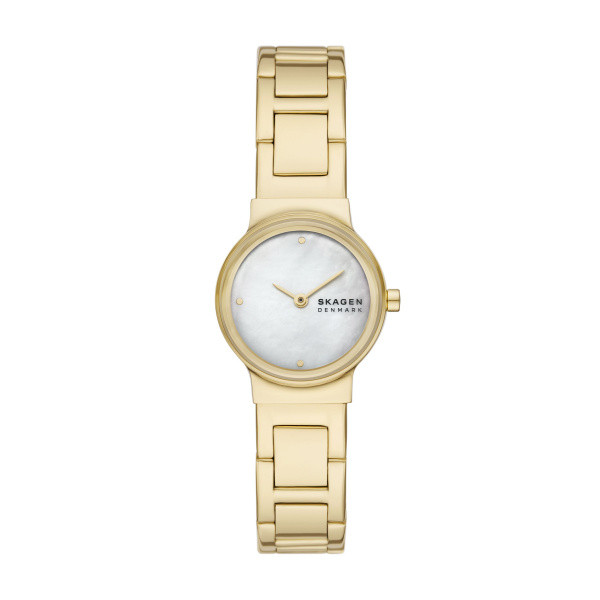 Orologio da donna della collezione Freja Lille con cassa da 26 mm in acciaio dorato e bracciale in acciaio dorato a tre file con chiusura a scatto. Monta movimento a batteria 2 sfere su bel quadrante in madreperla bianca con lancette dorate. Impermeabile fino a 5 bar, packaging dedicato