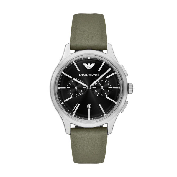 Elegante orologio da uomo con cassa da 42 mm in acciaio satinato, vetro minerale bombato e morbido cinturino in pelle martellata verde oliva. Monta movimento a batteria con datario a ore 6, cronografo e indicazione delle 24 ore su bel quadrante nero con indici a bastone e lancette silver. Corona marchiata, impermeabile fino a 5 bar. Packaging dedicato e certificato di autenticità