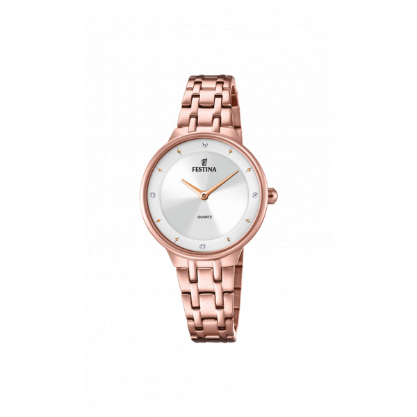Elegante orologio da donna con cassa color rosegold da 31 mm e bracciale in acciaio con trattamento PVD rosato. Monta movimento al quarzo a batteria 2 sfere su quadrante argentè con rehaut con soli indici e 4 cristalli bianchi. Lancette e finiture rosate, impermeabile fino a 5 atmosfere.