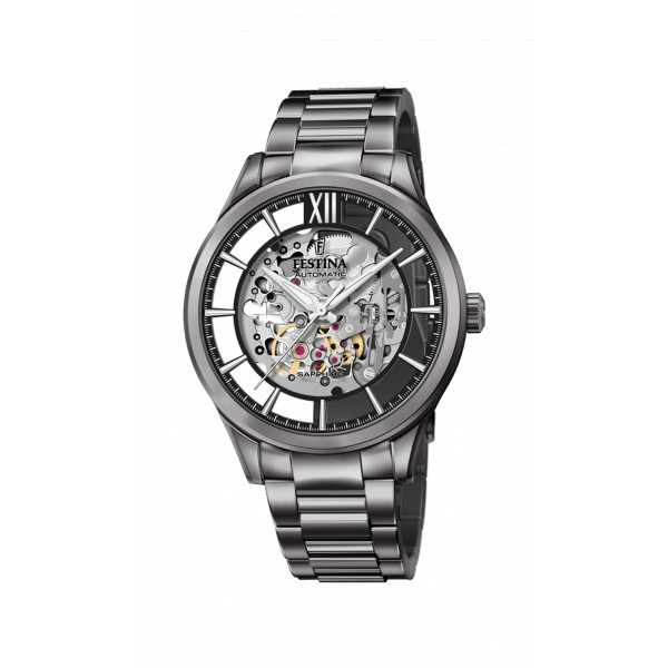 Originale orologio da uomo con cassa da 42,5 mm e bracciale in acciaio brunito lucido e satinato con chiusura di sicurezza. Monta bel movimento automatico solo tempo scheletrato ben visibile dal vetro zaffiro, con il 12 in numeri romani sulla parte esterna del quadrante trasparente, finiture silver e lancette nere. Fondo a vista e impermeabilità di 5 atmosfere.