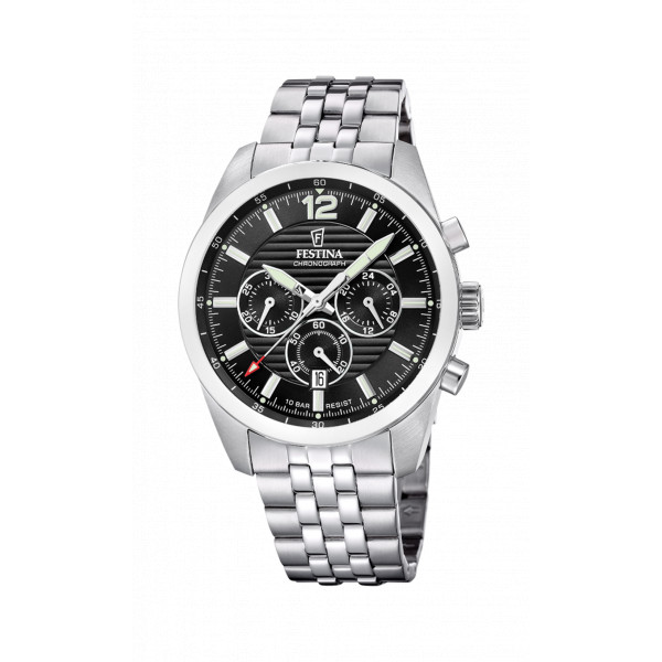 Orologio da uomo della linea Timeless con cassa da 43,5 mm in acciaio, vetro minerale piatto e bracciale in acciaio lucido e satinato con pratica chiusura di sicurezza. Monta movimento al quarzo con crono, datario a ore 6 e indicazione delle 24 ore su quadrante nero lavorato con indici e lancette luminose con finiture silver. Impermeabile fino a 10 bar