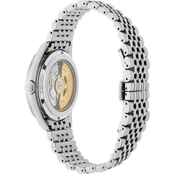 Orologio classico della linea Presage con cassa in acciaio da 40 mm, vetro zaffiro e bracciale di metallo a maglie piccole ispirato agli anni 70 con chiusura deployante. Monta movimento meccanico automatico 6R55, ben visibile dal fondo a vista, con datario a ore 3 su splendido quadrante curvo di colore blu effetto seta con soli indici e lancette silver satinate. Impermeabile fino a 10 atmosfere