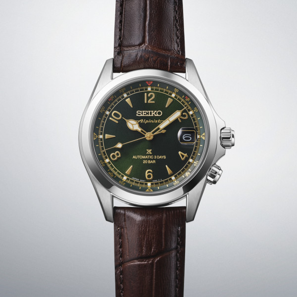 Orologio da uomo della collezione Prospex NEW Alpinist con cassa in acciaio da 39,5 mm con vetro zaffiro curvo con lente e cinturino in pelle stampata marrone con chiusura deployante. Monta movimento meccanico automatico con datario su quadrante verdecon indici, numeri pari e lancette a cattedrale Lumibrite dorate. Ghiera girevole interna con funzione bussola, corona a vite e WR 20 bar