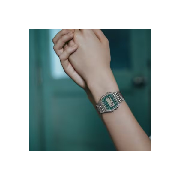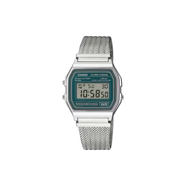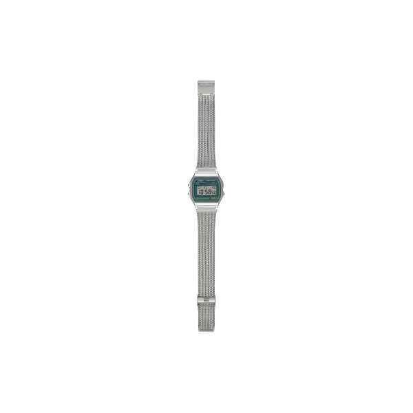 Orologio unisex della linea Vintage con cassa in resina cromata e nuovo bracciale in maglia con chiusura scorrevole. Monta movimento digitale al quarzo con funzioni di luce, crono e sveglia su display grigio con numeri scuri e contorno verde. Water resistant