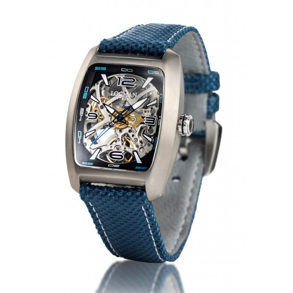 Orologio da uomo della collezione Sport con cassa tonneau in acciaio satinato, fondo a vista in titanio, vetro minerale bombato e cinturino tecnico in lordura blu con cucitura bianca. Monta movimento meccanico automatico SIO su quadrante scheletrato con indici e 4 numeri arabi, rehaut blu e vistose lancette luminose. Corono loggata L e impermeabilità di 20 bar