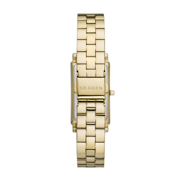 Orologio da donna della collezione Hagen con cassa rettangolare in acciaio dorato e bracciale a 3 file in acciaio dorato con chiusura di sicurezza. Monta movimento a batteria su quadrante color champagne con soli indici e lancette dorate. Impermeabile fino a 3 atmosfere