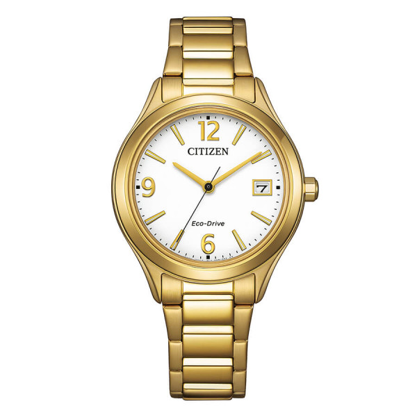 Orologio da donna della collezione OF Lady con cassa in acciaio dorato da 33,5 mm e bracciale in acciaio dorato lucido e satinato con chiusura di sicurezza. Monta movimento tre sfere Eco Drive a ricarica solare con data a ore 3 su quadrante bianco con tre numeri arabi, indici e lancette dorate. Water resistant 5 BAR.
