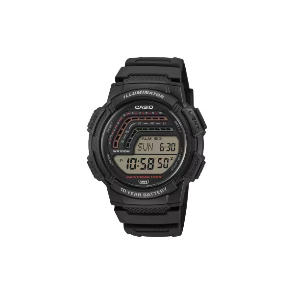 Orologio dallo stile sportivo con cassa in resina nera da 45 mm e cinturino in gomma nera. Monta movimento digitale con batteria a lunga durata su quadrante in stile retrò e display grigio ben leggibile; lo completano le funzioni di cronometro, timer +, sveglia, world time e luce. Impermeabile fino a 10 bar