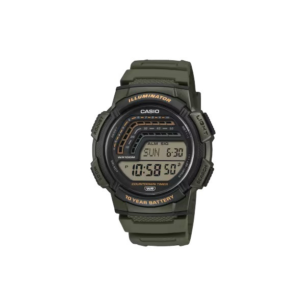 Orologio dallo stile sportivo con cassa in resina nera da 45 mm e cinturino in gomma verde oliva. Monta movimento digitale con batteria a lunga durata su quadrante in stile retrò e display grigio ben leggibile; lo completano le funzioni di cronometro, timer +, sveglia, world time e luce. Impermeabile fino a 10 BAR.