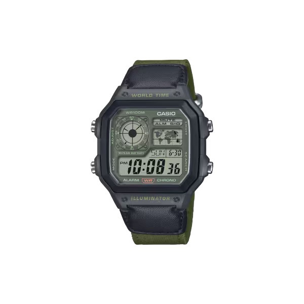 Orologio in stile vintage con cassa geometrica in resina grigia e cinturino tecnico in cordura verde. Originale display digitale a cristalli liquidi con 4 finestre e funzioni di world time, crono, timer, 5 sveglie. Luce a led arancione e impermeabilità di 100 metri.