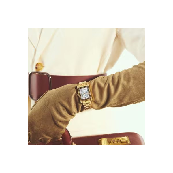 Orologio da donna con cassa di forma rettangolare in acciaio dorato e bracciale a 3 file in acciaio dorato con chiusura di sicurezza. Monta movimento a batteria 3 sfere su quadrante argentè con indici e 4 numeri arabi e lancette dorate. Water resistant.