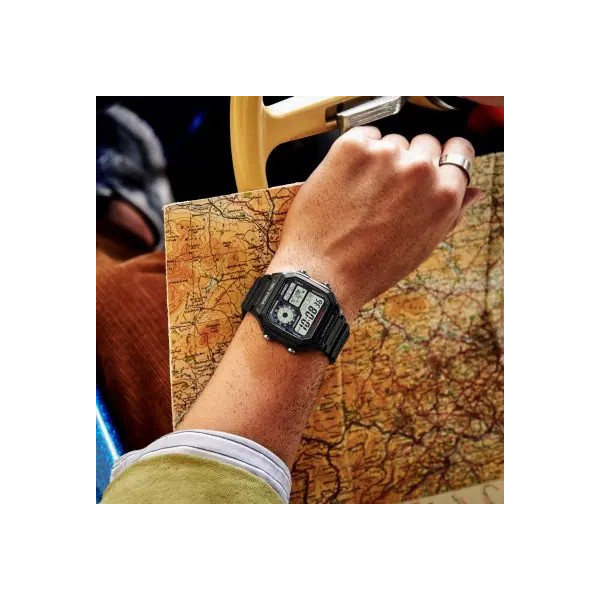 Orologio in stile vintage con cassa geometrica in resina nera e cinturino in gomma nera. Originale display digitale a cristalli liquidi con 4 finestre e funzioni di world time, crono, timer, 5 sveglie. Luce a led arancione e impermeabilità di 100 metri