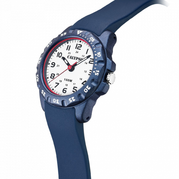 Orologio da bimbo con cassa in resina blu con ghiera girevole unidirezionale e cinturino in silicone blu. Monta movimento a batteria 3 sfere su quadrante bianco con lancette nere e tutti i numeri ben visibili neri. Impermeabile fino a 10 atmosfere.