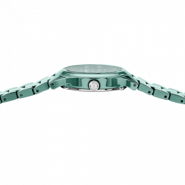 Orologio da donna della collezione Ceramic con cassa in ceramica da 30,5 mm e bracciale in ceramica verde con chiusura di sicurezza. Monta movimento a batteria due sfere su quadrante verde lucido con indici e due numeri arabi e finiture silver. Impermeabilità di 3 ATM.