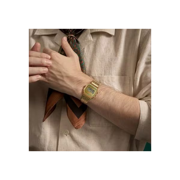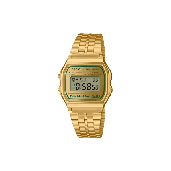 Orologio unisex della linea Vintage con cassa in resina dorata e bracciale in metallo con trattamento PVD dorato. Monta movimento digitale al quarzo con funzioni di luce, crono e sveglia su display beige con numeri scuri e quadrante dorato specchiato con contorno verde. Water resistant