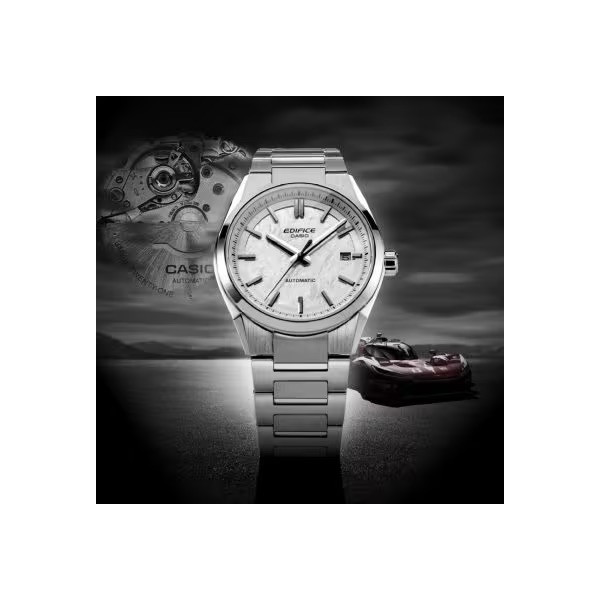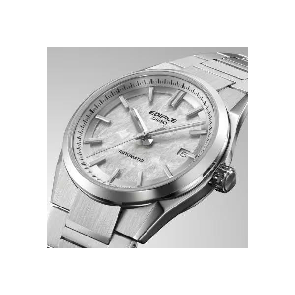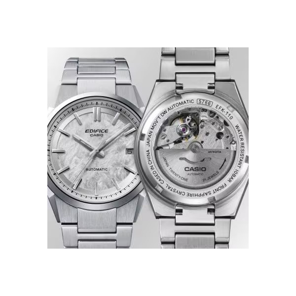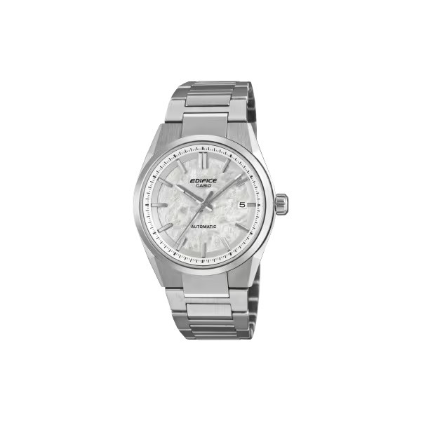 Ecco il primo orologio automatico di Casio! Cassa in acciaio da 38 mm finemente lavorata, vetro zaffiro antigraffio e splendido bracciale in acciaio a maglie piene con chiusura di sicurezza. Monta movimento automatico, ben visibile dal fondo a vista, con datario a ore 3 su bel quadrante color ghiaccio effetto pietra con soli indici e lancette silver. Made in Japan, impermeabile fino a 10 bar.