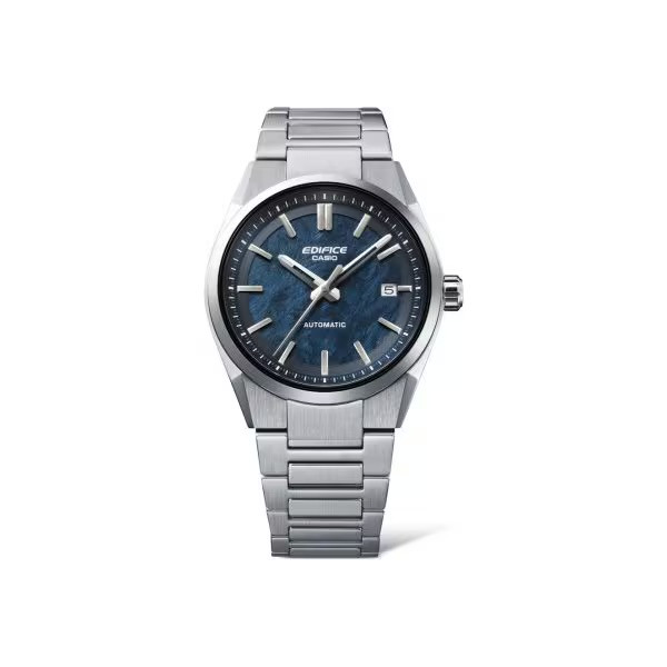 Ecco il primo orologio automatico di Casio! Cassa in acciaio da 38 mm finemente lavorata, vetro zaffiro antigraffio e splendido bracciale in acciaio a maglie piene con chiusura di sicurezza. Monta movimento automatico, ben visibile dal fondo a vista, con datario a ore 3 su bel quadrante blu effetto pietra con soli indici e lancette silver. Made in Japan, impermeabile fino a 10 bar.