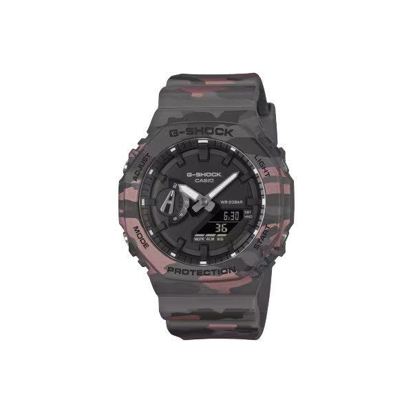 Nuova versione del mitico G-shock 2100 della serie Camouflage con cassa da 45 mm con lunetta ottagonale e cinturino interamente serigrafati con grafica mimetica nero viola. Monta movimento analogico-digitale a batteria con funzioni di luce Led, cronometro, timer, world time e 5 sveglie su quadrante nero con soli indici e lancette luminose. Wr 20 bar. Pronto a stupire i tuoi amici??