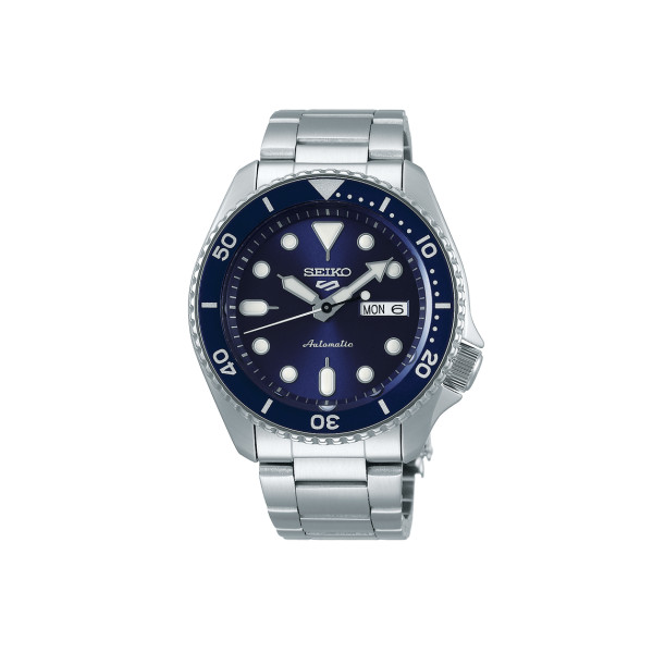 Orologio da uomo della linea 5 sports con robusta cassa in acciaio da 42,5 mm con ghiera girevole con IP blu e numeri silver, vetro Hardlex e bracciale in acciaio. Monta movimento meccanico automatico 3 sfere con calendario giorno e data su quadrante blu ben visibile con indici e lancette con Lumibrite. Corona a ore 4, fondo a vite con movimento a vista, WR 10 bar