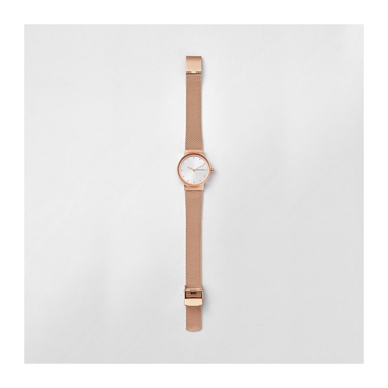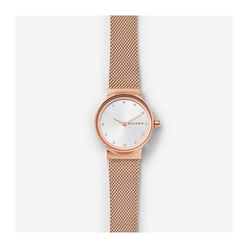 Orologio da donna Skagen Denmark della linea Freja, con quadrante argenté e indici con zirconi. Cassa e bracciale in acciaio in maglia milano, tutto con finitura rose gold. Monta movimento al quarzo due sfere ed è impermeabile fino a 5 atm