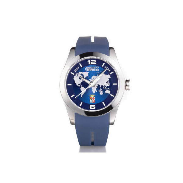Orologio Locman della collezione Island in edizione speciale realizzata in occasione del tour mondiale della nave scuola Amerigo Vespucci. Cassa in acciaio da 40 mm con fondo in itanioe cinturino in silicone blu, monta movimento al quarzo tre sfere con datario su quadrante celebrativo blu con disegno del mondo e indici, 2 numeri e lancette silver. Wr 50 metri, cofanetto dedicato