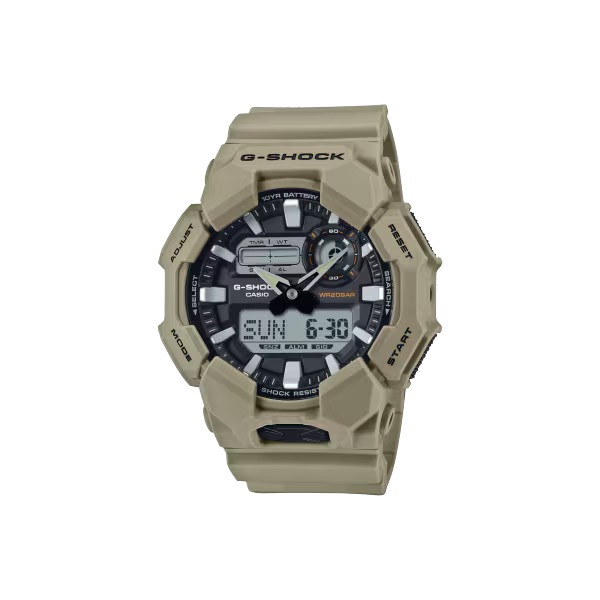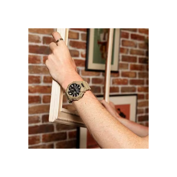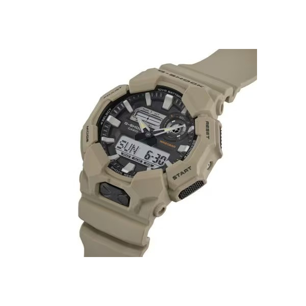 Orologio G-Shock da uomo con cassa in resina rinforzata color kaki e cinturino in gomma kaki. Monta nuovo movimento al quarzo analogico- digitale con batteria da 10 anni di durata e funzioni di cronometro, timer, sveglie multifunzione, world time e luce Led ad alta luminosità su quadrante nero con 3 display grigi, indici e lancette luminose su base silver. Robisto e impermeabile fino a 20 bar