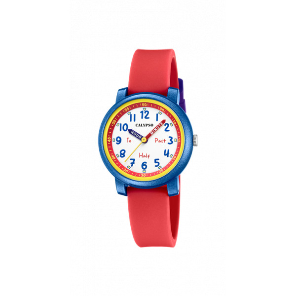 Simpatico orologio da bimba con cassa in resina blu glitterata e cinturino in silicone rosso. Monta movimento a batteria 3 sfere su quadrante bianco con lancette colorate e tutti i numeri blu ben visibili. Impermeabile fino a 5 atmosfere. Ideale per imparare a leggere l'ora!