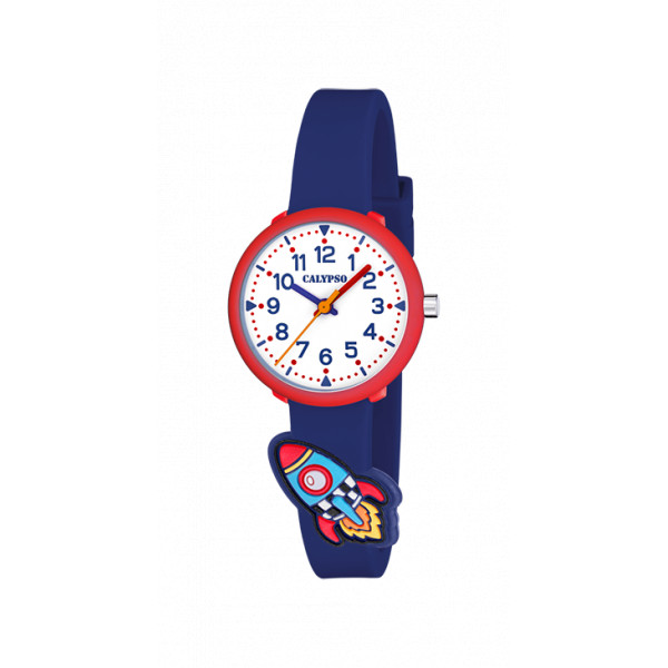 Simpatico orologio da bimbo con cassa in resina rossa e cinturino in silicone blu con razzo colorato. Monta movimento a batteria 3 sfere su quadrante bianco con lancette colorate e tutti i numeri blu ben visibili. Impermeabile fino a 3 atmosfere.